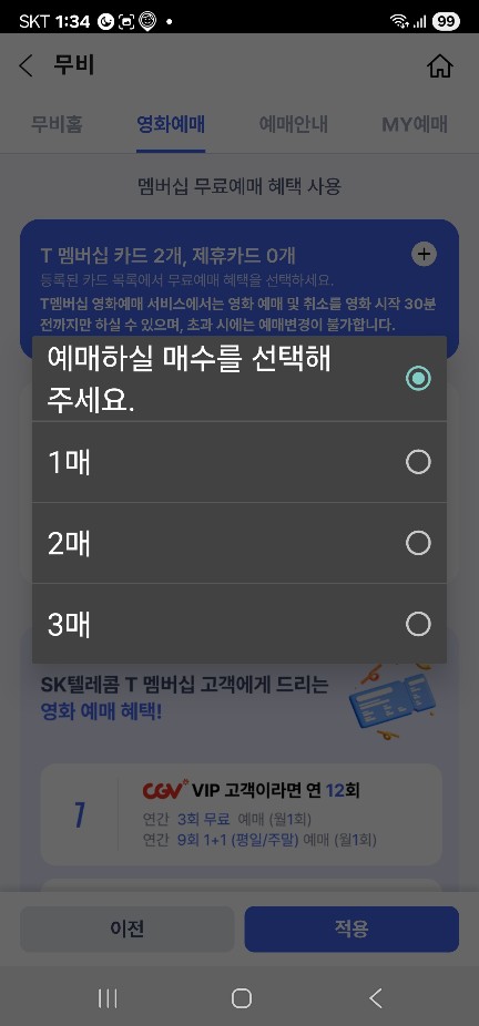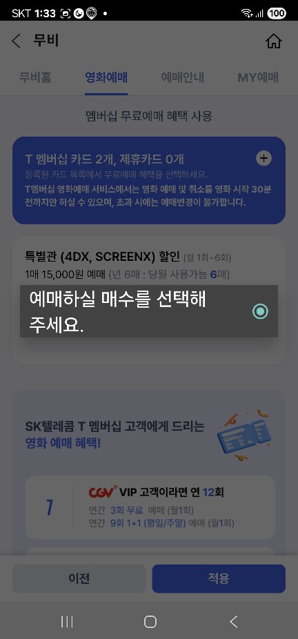 - 특별상영관 예매시 15,000원 미만일 경우 예매 자체가 안됨. (이 부분 때문에 SKT상담원과 꽤 오랜 시간 상담)